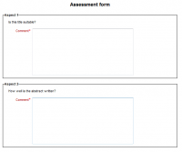 In this case, the assessment form consists of a set of criteria. Each criterion is graded separately using either a number grade (eg out of 100) or a scale (using either one of site-wide scale or a scale defined in a course). Each criterion can have its weight set. Reviewers can put comments to all assessed criteria.