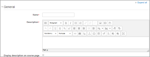 • From the the "Add an activity or resource" link (or, if not present, the "Add a resource" drop down menu), choose Page All settings may expanded by clicking the "Expand all" link top right.