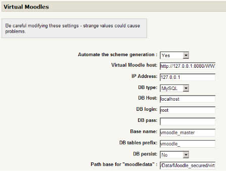o Automate schema : Tells VMoodle to preset the deployment form. o Virtual host: Gives the pattern for generating new Moodle host names. o Database type: Preset the type of database used (MySQL or Postgres). o Database host: Preset value for the database hostname. o Database login: Preset value for the database user login. o Database password: Preset value for the database user password. o Database name: Preset a generation pattern for naming the database. o Table prefix: Preset value for the table name prefix. o Persistant connection: Preset value. Persistant connections will not close at end of the PHP script and be reused. o Moodledata path: Preset the generation pattern for the Moodledata path.