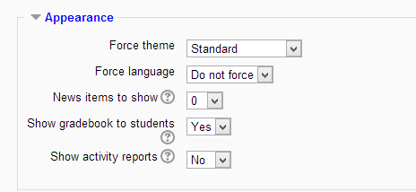 Here you can decide whether to allow students to see the link to grades in the Administration block. If your course doesn't use graded activities, it makes sense to disable this. If grades are used and this link is disabled, students can still see their grade from the actual activity itself, such as an assignment