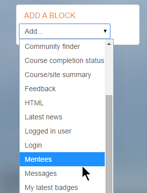 - Go to the Add Blocks block and select the Mentees block and when it appears, click on the Configuration icon.