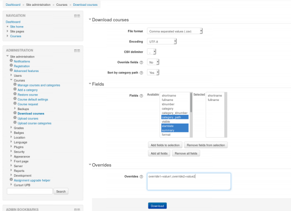 Allows an administrator to download a list of all the courses to a comma-separated values format (CSV) or Excel 2007 file format. In addition to the web interface there is also a command line tool located in admin/tool/downloaddata/cli/downloaddata.php.
