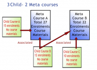 Examples: one "child" course (a course linked to a meta course) can be associated with many meta courses. Or one meta course can have many child courses associated with it. Both the child courses (non-meta courses) and the meta courses are independent and can be recycled many times, that is, each can be associated with many of the other.