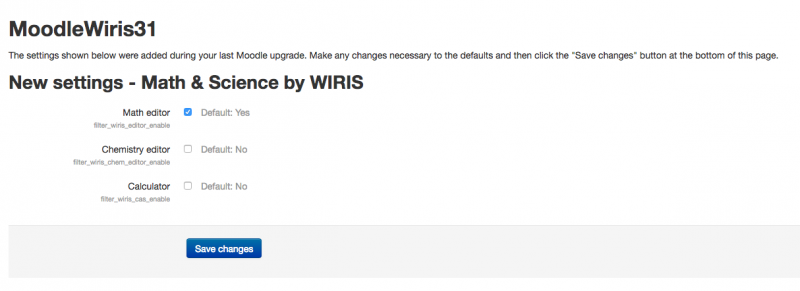 Once we click on "Upgrade Moodle database now", the following page will appear automatically, where you will be able to activate the Chemistry editor and the Calculator (the Math editor is always enabled by default).